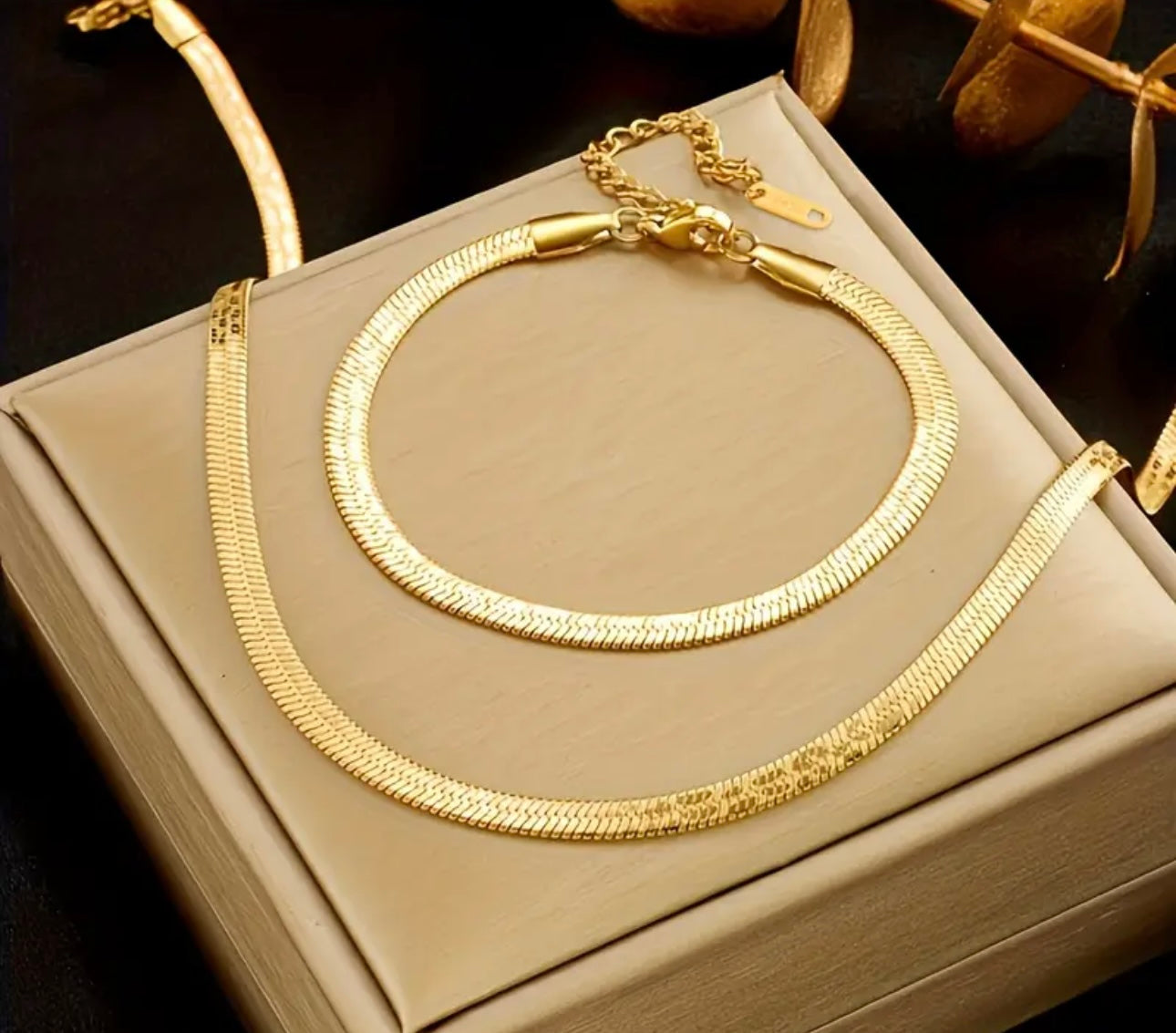 18K Gold Plated Snake chain bracelet and necklace combo in a Jewelry Box